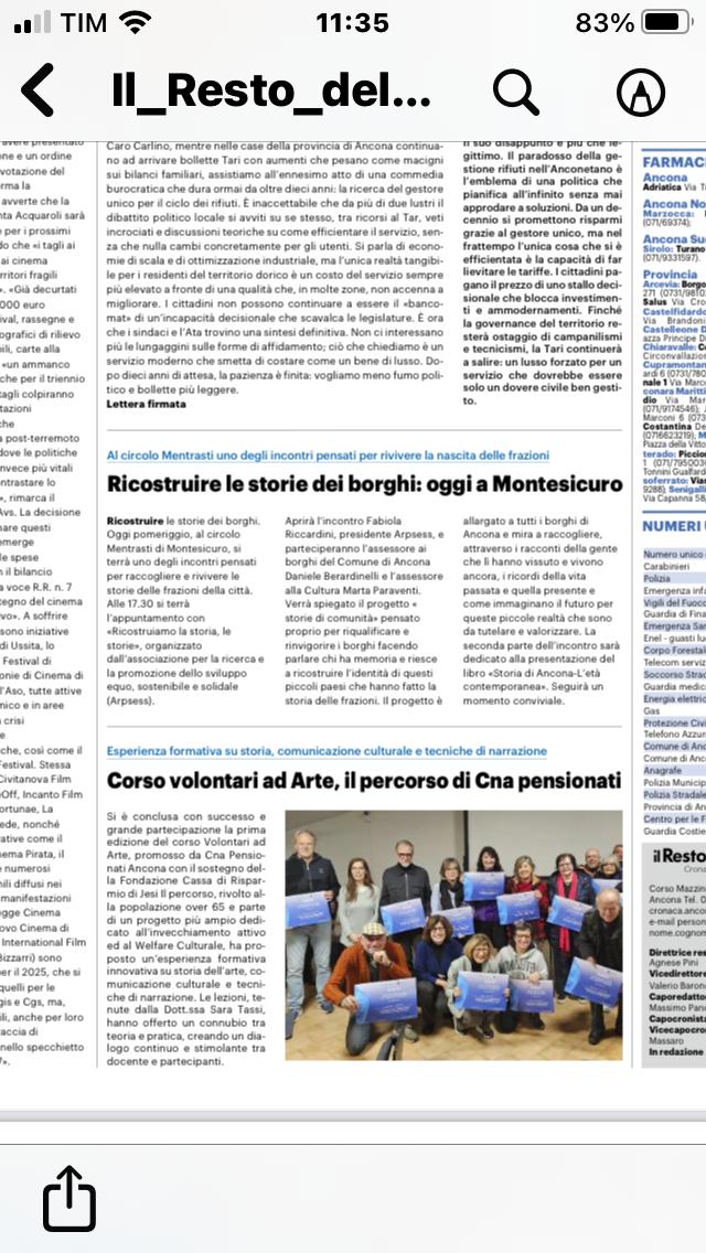 Hanno partecipato all’evento : Daniele Berardinelli (saluti istituzionali), Assessore ai borghi del Comune di Ancona; Marta Paraventi, Assessore alla cultura (La cultura nel Comune di Ancona e nei borghi); Alessandra Mannini (Introduzione con riferimento al progetto “storie di comunità” per i borghi di Ancona, a partire da storie di comunità a Offagna Un’esperienza di raccolta di storie di comunità nel paese di Offagna); Fabiola Riccardini (Introduzione alla storia anconetana e riflessioni sulle differenze di metodo delle storie di comunità e della storia di città, “Storia di Ancona. L’età contemporanea (1796-2001)” a cura di Fulvio Cammarano (Presidente dell’istituto storia marche di Ancona). Conclusioni a cura di Fabiola Riccardini (Presidente Arpsess)